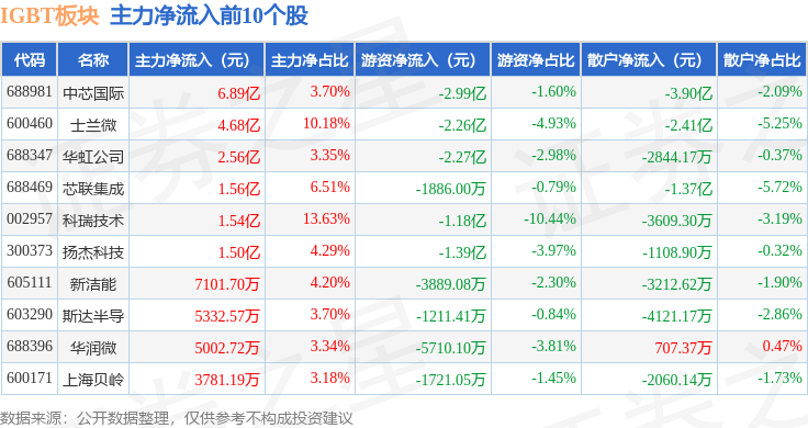 从资金流向上来看,当日IGBT板块主力资金净流出3.25亿元,游资资金净流出5.41亿元,散户资金净流入8.66亿元。IGBT板块个股资金流向见下表: