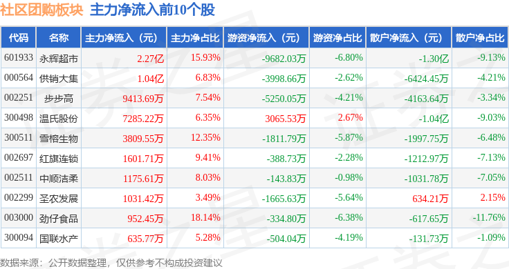 从资金流向上来看,当日社区团购板块主力资金净流入4.07亿元,游资资金净流出2.45亿元,散户资金净流出1.61亿元。社区团购板块个股资金流向见下表: