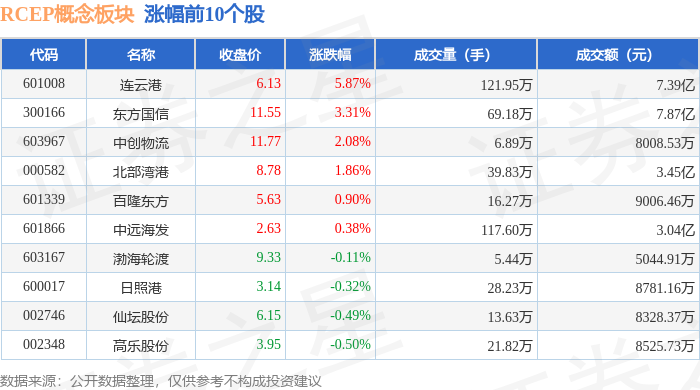 证券之星消息,10月13日RCEP概念板块较上一交易日下跌0.12%,ST新华锦领跌。当日上证指数报收于3889.5,下跌0.19%。深证成指报收于13231.47,下跌0.93%。RCEP概念板块个股涨跌见下表: