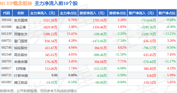 从资金流向上来看,当日RCEP概念板块主力资金净流出1.26亿元,游资资金净流入7055.04万元,散户资金净流入5557.12万元。RCEP概念板块个股资金流向见下表: