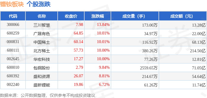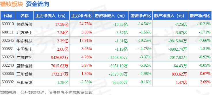 从资金流向上来看,当日镨钕板块主力资金净流入29.63亿元,游资资金净流出18.19亿元,散户资金净流出11.44亿元。镨钕板块个股资金流向见下表: