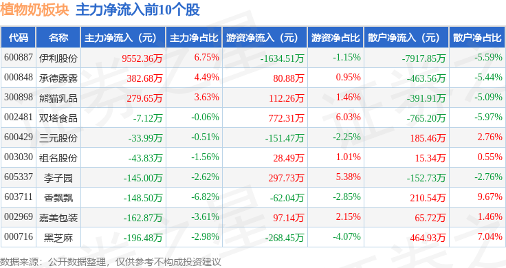 从资金流向上来看,当日植物奶板块主力资金净流出1249.94万元,游资资金净流入3818.2万元,散户资金净流出2568.26万元。植物奶板块个股资金流向见下表:
