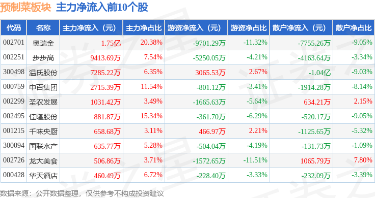 从资金流向上来看,当日预制菜板块主力资金净流出4311.03万元,游资资金净流入889.42万元,散户资金净流入3421.61万元。预制菜板块个股资金流向见下表: