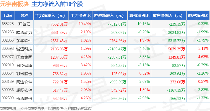 从资金流向上来看,当日元宇宙板块主力资金净流出37.88亿元,游资资金净流入1.85亿元,散户资金净流入36.02亿元。元宇宙板块个股资金流向见下表: