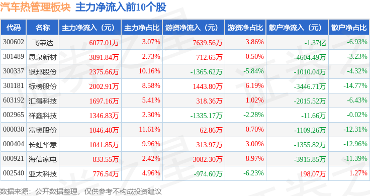 从资金流向上来看,当日汽车热管理板块主力资金净流出27.05亿元,游资资金净流入4664.2万元,散户资金净流入26.58亿元。汽车热管理板块个股资金流向见下表: