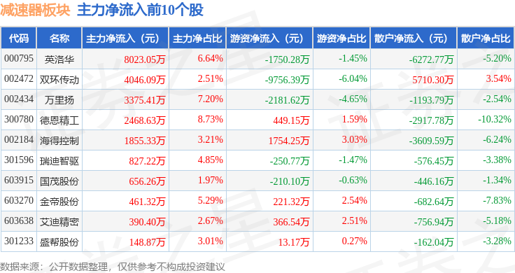 从资金流向上来看,当日减速器板块主力资金净流出12.38亿元,游资资金净流出3.67亿元,散户资金净流入16.04亿元。减速器板块个股资金流向见下表:
