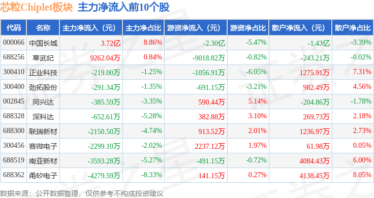 从资金流向上来看,当日芯粒Chiplet板块主力资金净流出6.99亿元,游资资金净流入1.79亿元,散户资金净流入5.2亿元。芯粒Chiplet板块个股资金流向见下表: