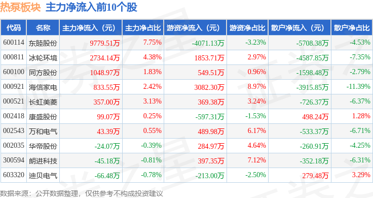 从资金流向上来看,当日热泵板块主力资金净流出2.53亿元,游资资金净流入6244.28万元,散户资金净流入1.9亿元。热泵板块个股资金流向见下表: