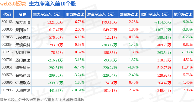 从资金流向上来看,当日web3.0板块主力资金净流出6.83亿元,游资资金净流出6921.6万元,散户资金净流入7.52亿元。web3.0板块个股资金流向见下表: