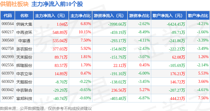 从资金流向上来看,当日供销社板块主力资金净流出100.95万元,游资资金净流入759.09万元,散户资金净流出658.14万元。供销社板块个股资金流向见下表: