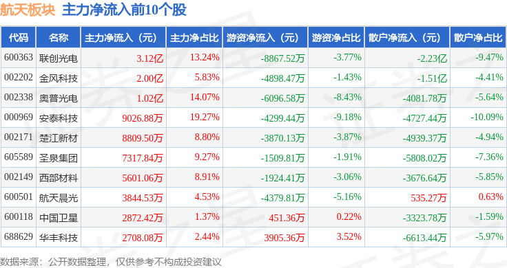 从资金流向上来看,当日航天板块主力资金净流出3927.28万元,游资资金净流出4.01亿元,散户资金净流入4.41亿元。航天板块个股资金流向见下表: