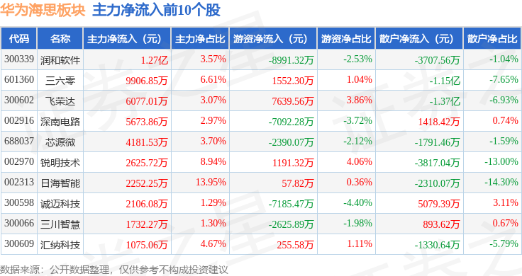 从资金流向上来看,当日华为海思板块主力资金净流出16.33亿元,游资资金净流入2.82亿元,散户资金净流入13.51亿元。华为海思板块个股资金流向见下表: