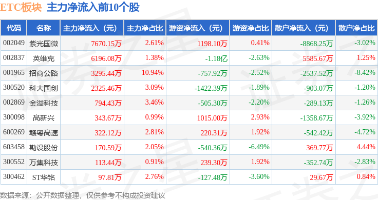 从资金流向上来看,当日ETC板块主力资金净流出4.56亿元,游资资金净流出1.01亿元,散户资金净流入5.57亿元。ETC板块个股资金流向见下表: