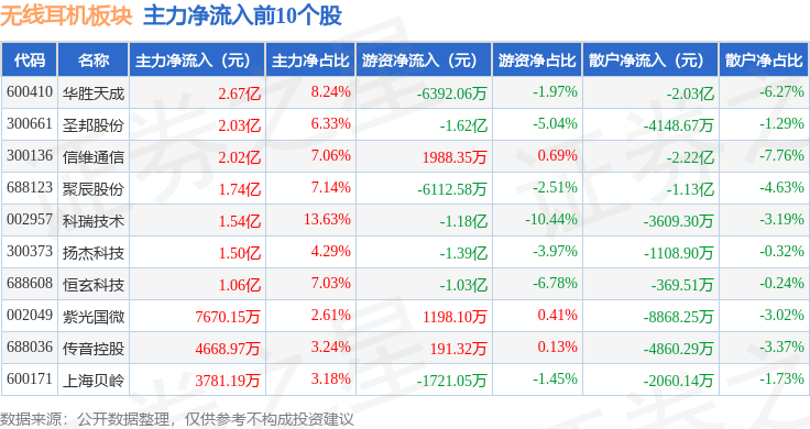 从资金流向上来看,当日无线耳机板块主力资金净流出56.03亿元,游资资金净流入9.57亿元,散户资金净流入46.46亿元。无线耳机板块个股资金流向见下表: