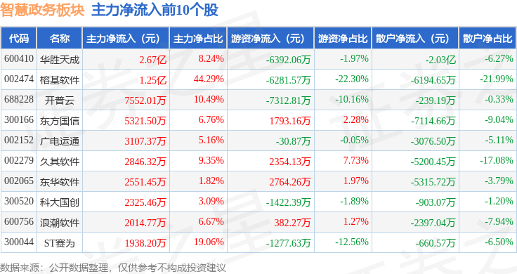 从资金流向上来看,当日智慧政务板块主力资金净流出11.13亿元,游资资金净流出5603.57万元,散户资金净流入11.69亿元。智慧政务板块个股资金流向见下表: