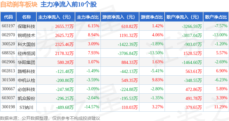 从资金流向上来看,当日自动刹车板块主力资金净流出7.47亿元,游资资金净流出2733.83万元,散户资金净流入7.75亿元。自动刹车板块个股资金流向见下表: