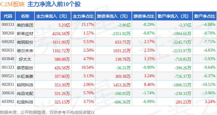 从资金流向上来看,当日C2M板块主力资金净流入3.44亿元,游资资金净流出2.2亿元,散户资金净流出1.24亿元。C2M板块个股资金流向见下表: