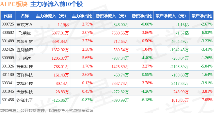 从资金流向上来看,当日AI PC板块主力资金净流出16.36亿元,游资资金净流入5.32亿元,散户资金净流入11.04亿元。AI PC板块个股资金流向见下表: