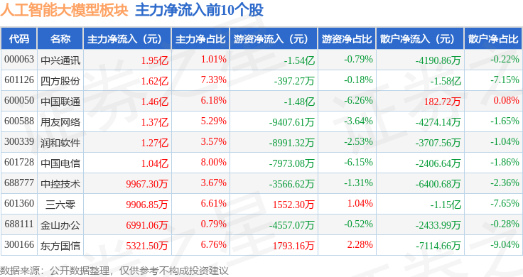 从资金流向上来看,当日人工智能大模型板块主力资金净流出19.71亿元,游资资金净流入1.36亿元,散户资金净流入18.35亿元。人工智能大模型板块个股资金流向见下表: