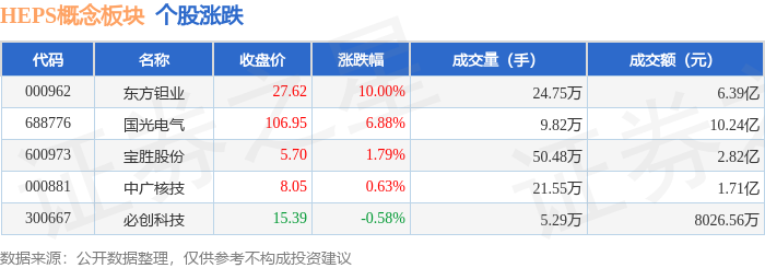 证券之星消息,10月13日HEPS概念板块较上一交易日上涨5.35%,东方钽业领涨。当日上证指数报收于3889.5,下跌0.19%。深证成指报收于13231.47,下跌0.93%。HEPS概念板块个股涨跌见下表: