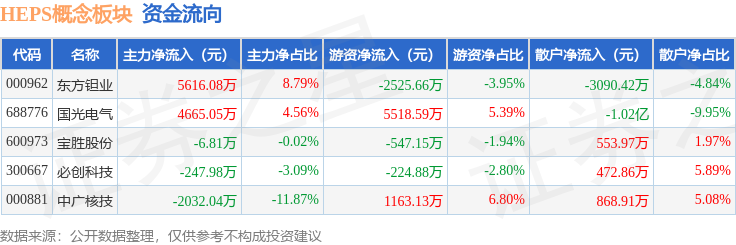 从资金流向上来看,当日HEPS概念板块主力资金净流入7994.3万元,游资资金净流入3384.02万元,散户资金净流出1.14亿元。HEPS概念板块个股资金流向见下表: