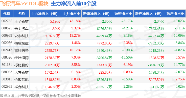 从资金流向上来看,当日飞行汽车/eVTOL板块主力资金净流出11.68亿元,游资资金净流出3.72亿元,散户资金净流入15.4亿元。飞行汽车/eVTOL板块个股资金流向见下表: