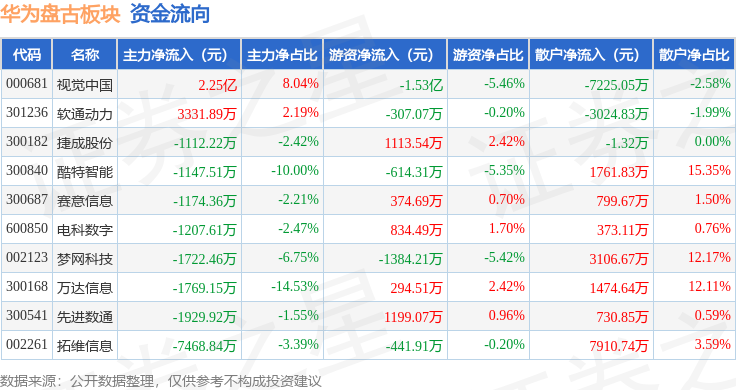 从资金流向上来看,当日华为盘古板块主力资金净流入8346.79万元,游资资金净流出1.43亿元,散户资金净流入5906.32万元。华为盘古板块个股资金流向见下表: