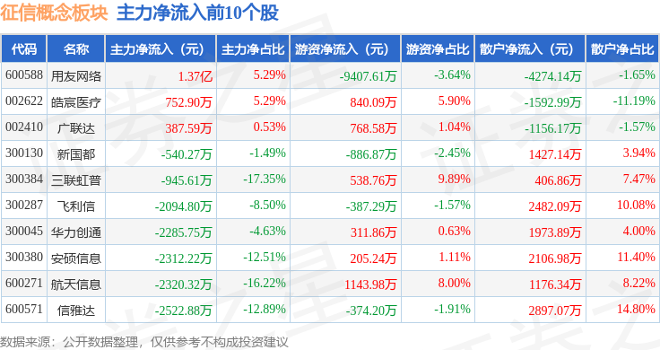 从资金流向上来看,当日征信概念板块主力资金净流出3.4亿元,游资资金净流出788.12万元,散户资金净流入3.48亿元。征信概念板块个股资金流向见下表: