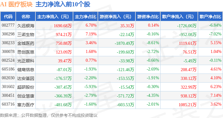 从资金流向上来看,当日AI 医疗板块主力资金净流出2.82亿元,游资资金净流入5707.42万元,散户资金净流入2.25亿元。AI 医疗板块个股资金流向见下表: