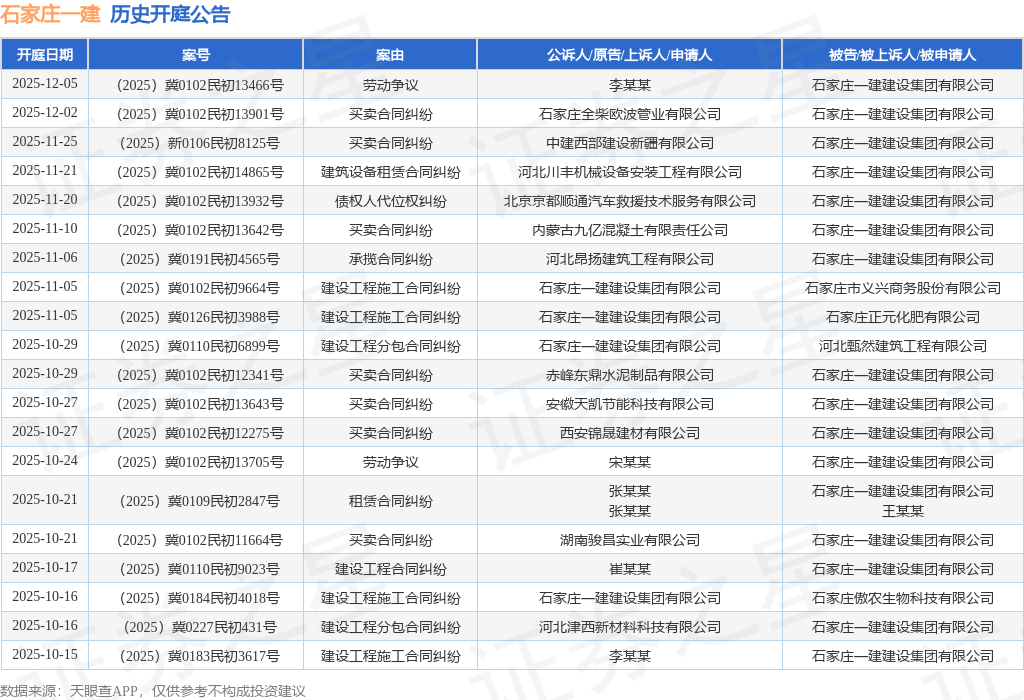 案号:(2025)冀0184民初4018号根据统计,近一年内以石家庄一建建设集团有限公司为当事人的历史开庭公告有229则,其中案由为“买卖合同纠纷”的公告以69则居首,其次为“建设工程施工合同纠纷”有55则,“建设工程合同纠纷”有18则。历史开庭公告(前20条)如下: