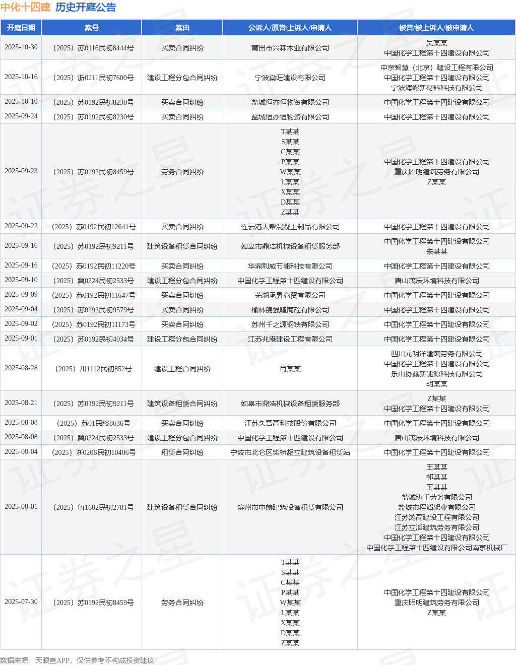 案号:(2025)浙0211民初7600号根据统计,近一年内以中国化学工程第十四建设有限公司为当事人的历史开庭公告有170则,其中案由为“建设工程施工合同纠纷”的公告以46则居首,其次为“买卖合同纠纷”有29则,“劳务合同纠纷”有20则。历史开庭公告(前20条)如下: