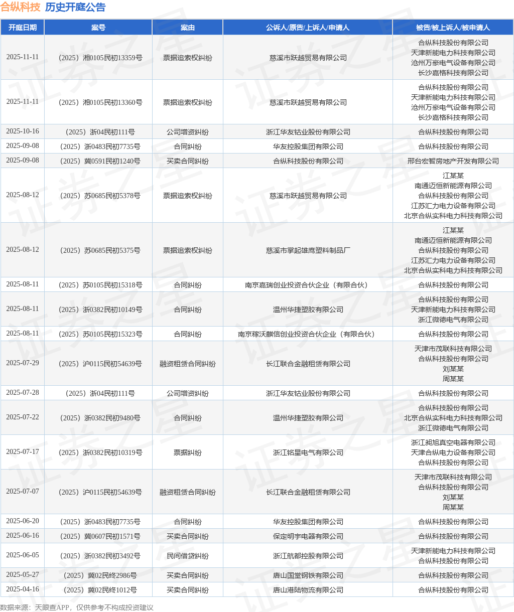 案号:(2025)浙04民初111号根据统计,近一年内以合纵科技股份有限公司为当事人的历史开庭公告有26则,其中案由为“买卖合同纠纷”的公告以8则居首,其次为“合同纠纷”有6则,“票据追索权纠纷”有4则。历史开庭公告(前20条)如下: