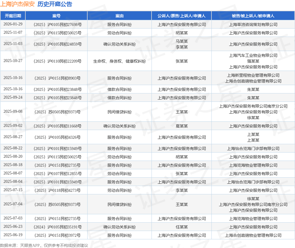案号:(2025)沪0151民初8903号根据统计,近一年内以上海沪杰保安服务有限公司为当事人的历史开庭公告有52则,其中案由为“服务合同纠纷”的公告以15则居首,其次为“劳动合同纠纷”有11则,“确认劳动关系纠纷”有6则。历史开庭公告(前20条)如下: