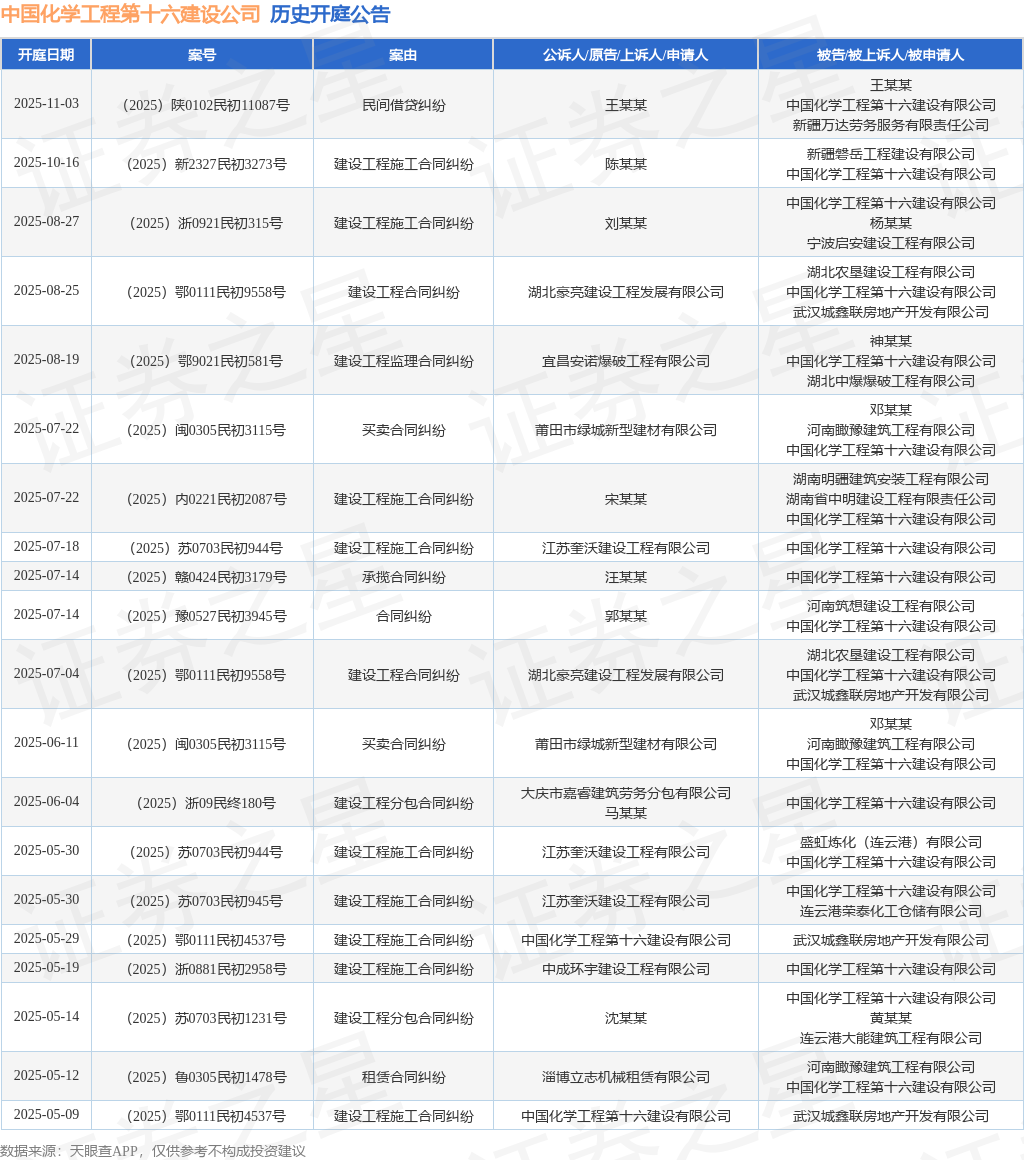 案号:(2025)新2327民初3273号根据统计,近一年内以中国化学工程第十六建设有限公司为当事人的历史开庭公告有86则,其中案由为“建设工程施工合同纠纷”的公告以31则居首,其次为“追索劳动报酬纠纷”有18则,“建设工程合同纠纷”有10则。历史开庭公告(前20条)如下: