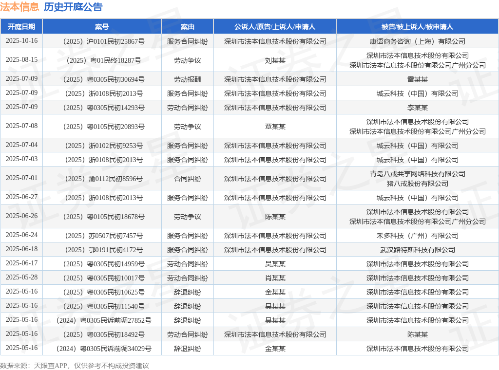 案号:(2025)沪0101民初25867号根据统计,近一年内以深圳市法本信息技术股份有限公司为当事人的历史开庭公告有52则,其中案由为“劳动合同纠纷”的公告以12则居首,其次为“服务合同纠纷”有11则,“劳动争议”有9则。历史开庭公告(前20条)如下: