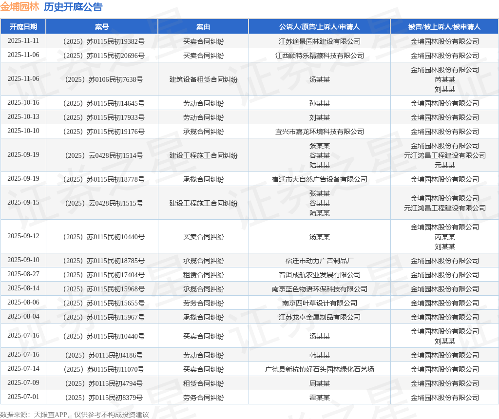 案号:(2025)苏0115民初14645号根据统计,近一年内以金埔园林股份有限公司为当事人的历史开庭公告有62则,其中案由为“买卖合同纠纷”的公告以23则居首,其次为“承揽合同纠纷”有6则,“劳动合同纠纷”有5则。历史开庭公告(前20条)如下: