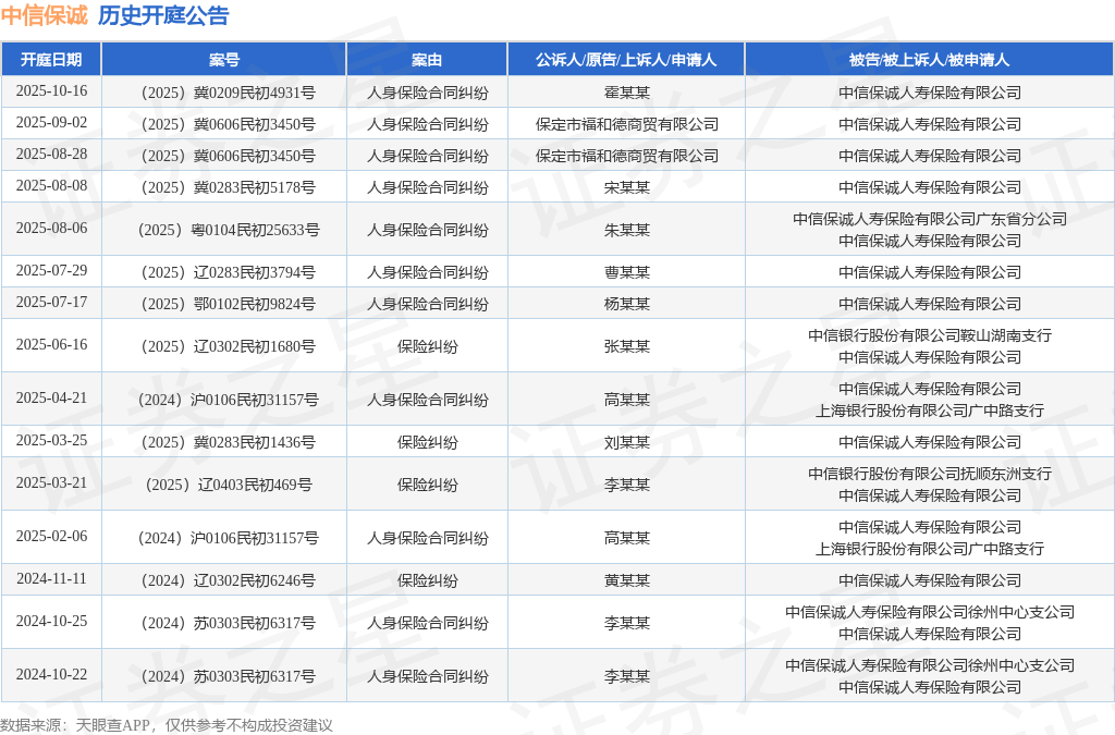 根据统计,近一年内以中信保诚人寿保险有限公司为当事人的历史开庭公告有15则,其中案由为“人身保险合同纠纷”的公告以11则居首,其次为“保险纠纷”有4则。历史开庭公告如下: