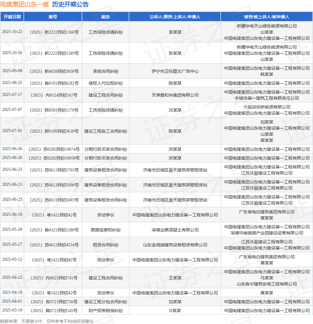案号:(2025)新2222民初1349号根据统计,近一年内以中国电建集团山东电力建设第一工程有限公司为当事人的历史开庭公告有31则,其中案由为“劳动争议”的公告以4则居首,其次为“建设工程合同纠纷”有4则,“工伤保险待遇纠纷”有3则。历史开庭公告(前20条)如下: