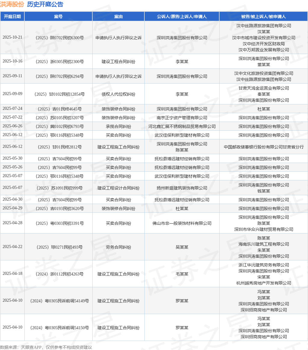 案号:(2025)浙0305民初2300号根据统计,近一年内以深圳洪涛集团股份有限公司为当事人的历史开庭公告有55则,其中案由为“买卖合同纠纷”的公告以16则居首,其次为“建设工程施工合同纠纷”有9则,“劳务合同纠纷”有6则。历史开庭公告(前20条)如下: