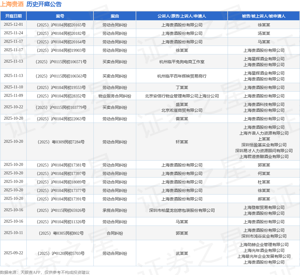案号:(2025)沪0104民初11326号根据统计,近一年内以上海贵酒股份有限公司为当事人的历史开庭公告有99则,其中案由为“劳动合同纠纷”的公告以36则居首,其次为“合同纠纷”有14则,“买卖合同纠纷”有10则。历史开庭公告(前20条)如下: