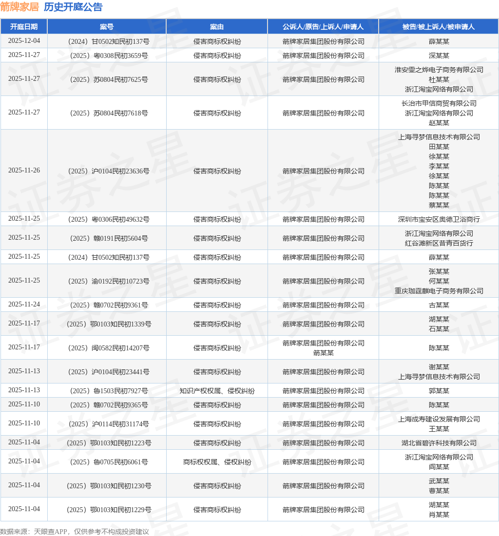 案号:(2025)浙0110民初25774号根据统计,近一年内以箭牌家居集团股份有限公司为当事人的历史开庭公告有526则,其中案由为“侵害商标权纠纷”的公告以456则居首,其次为“商标权权属、侵权纠纷”有24则,“不正当竞争纠纷”有8则。历史开庭公告(前20条)如下:
