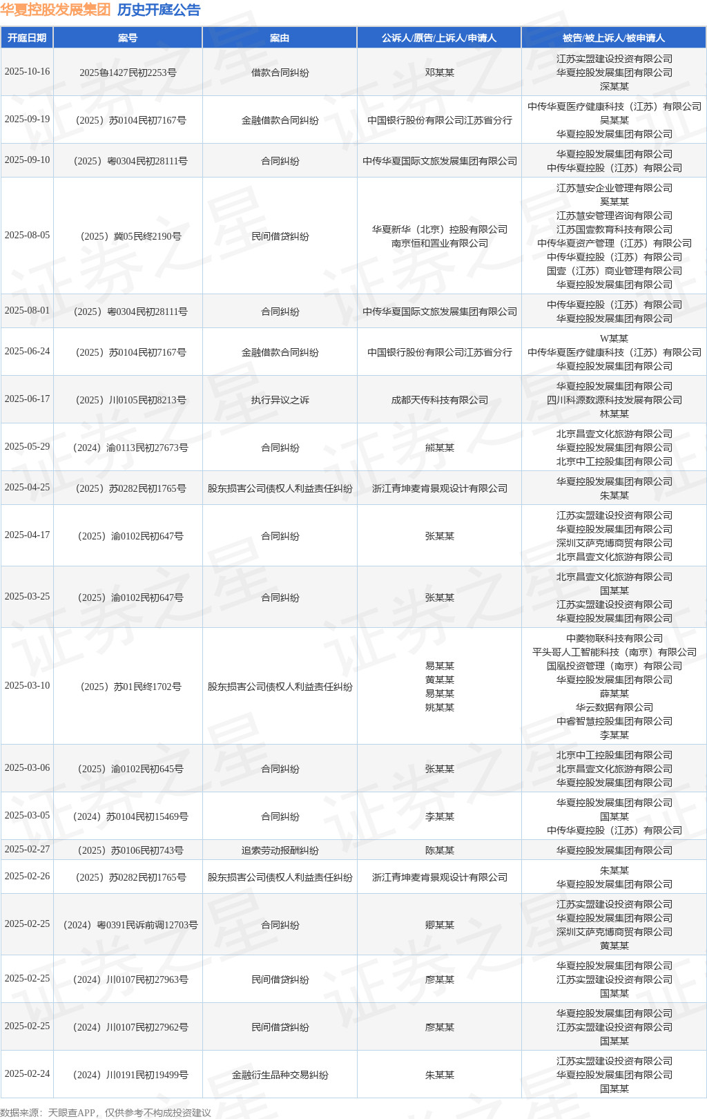 案号:2025鲁1427民初2253号根据统计,近一年内以华夏控股发展集团有限公司为当事人的历史开庭公告有68则,其中案由为“合同纠纷”的公告以40则居首,其次为“民间借贷纠纷”有6则,“股东损害公司债权人利益责任纠纷”有4则。历史开庭公告(前20条)如下: