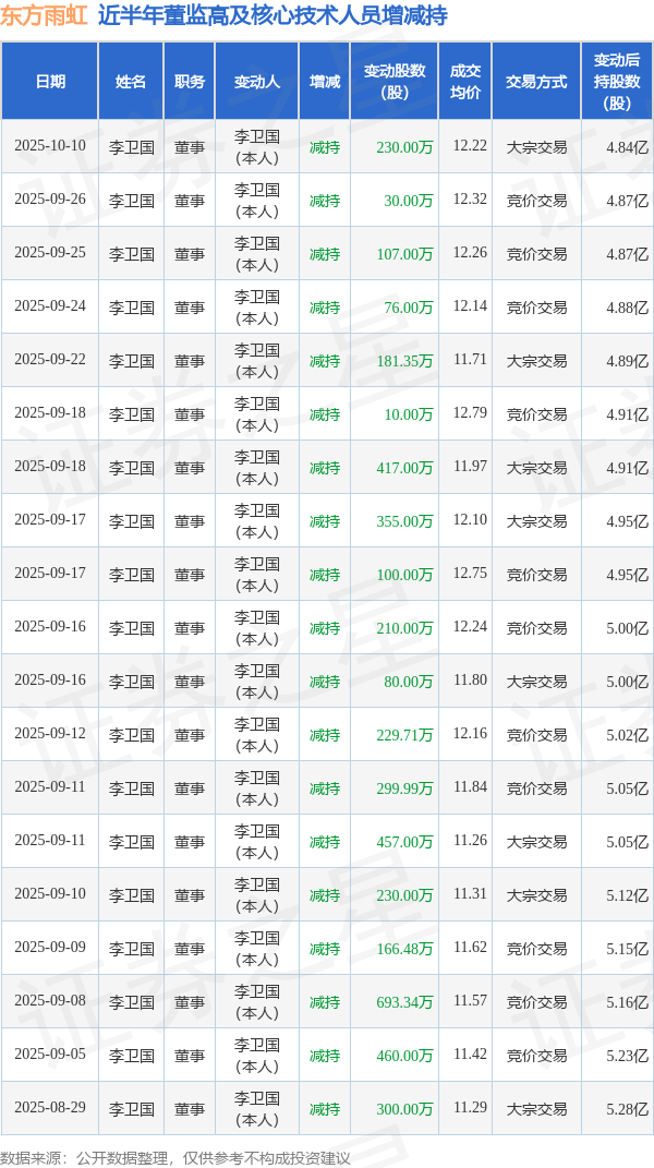 东方雨虹近半年内的董监高及核心技术人员增减持详情如下: