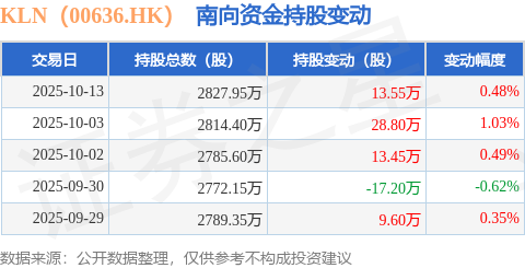 证券之星消息,10月13日南向资金增持13.55万股KLN(00636.HK)。近5个交易日中,获南向资金增持的有4天,累计净增持48.2万股。近20个交易日中,获南向资金增持的有15天,累计净增持269.98万股。截至目前,南向资金持有KLN(00636.HK)2827.95万股,占公司已发行普通股的1.55%。