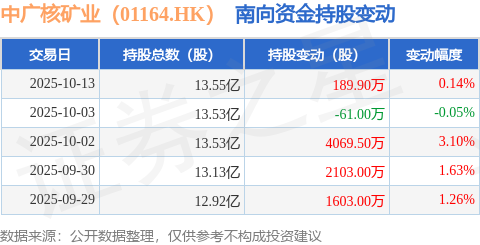 证券之星消息,10月13日南向资金增持189.9万股中广核矿业(01164.HK)。近5个交易日中,获南向资金增持的有4天,累计净增持7904.4万股。近20个交易日中,获南向资金增持的有12天,累计净增持7608.9万股。截至目前,南向资金持有中广核矿业(01164.HK)13.55亿股,占公司已发行普通股的17.81%。