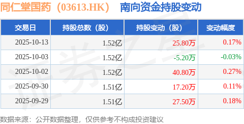 证券之星消息,10月13日南向资金增持25.8万股同仁堂国药(03613.HK)。近5个交易日中,获南向资金增持的有4天,累计净增持106.1万股。近20个交易日中,获南向资金增持的有16天,累计净增持505.5万股。截至目前,南向资金持有同仁堂国药(03613.HK)1.52亿股,占公司已发行普通股的18.16%。