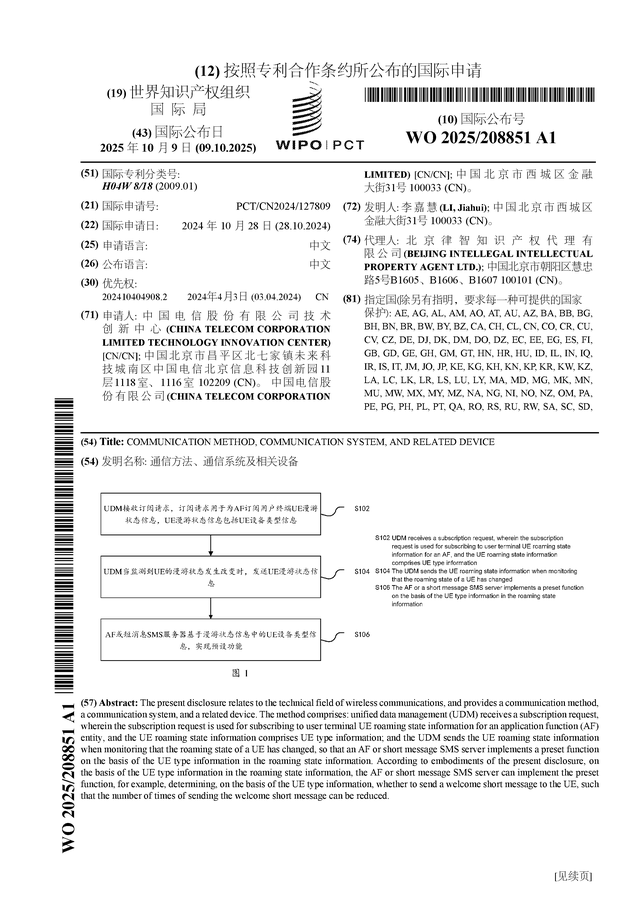 证券之星消息,根据企查查数据显示中国电信(601728)公布了一项国际专利申请,专利名为“通信方法、通信系统及相关设备”,专利申请号为PCT/CN2024/127809,国际公布日为2025年10月9日。