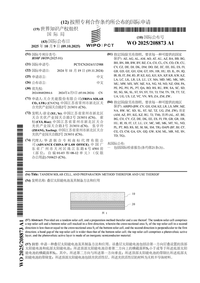 证券之星消息,根据企查查数据显示天合光能(688599)公布了一项国际专利申请,专利名为“叠层太阳能电池及其制备方法和应用”,专利申请号为PCT/CN2024/132988,国际公布日为2025年10月9日。