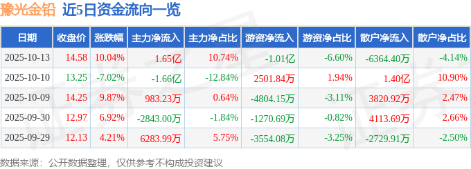 证券之星消息,截至2025年10月13日收盘,豫光金铅(600531)报收于14.58元,上涨10.04%,换手率10.14%,成交量110.53万手,成交额15.37亿元。