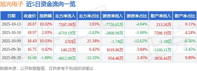证券之星消息,截至2025年10月13日收盘,旭光电子(600353)报收于20.87元,上涨10.02%,换手率11.55%,成交量95.74万手,成交额19.09亿元。